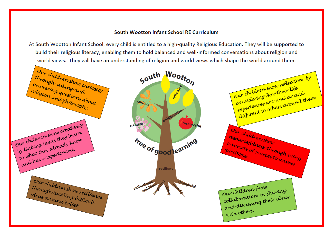 At South Wootton Infant School, we believe that every child is entitled to a high-quality Religious Education and it is our intent to provide this. Our pupils will experience RE as a multi-disciplinary subject. We will provide opportunities for the children to experience the disciplinary fields of theology, philosophy and the human/social sciences. We will ensure that the children have an in-depth investigation of Christianity from Reception and continuing through Year One and Year Two. The other principal world religions which will be studied are Hinduism in Year One and Islam in Year Two. We will ensure they also encounter world views. They will be supported to build their religious literacy, enabling them to hold balanced and well-informed conversations about religion and world views. They will have an understanding of religion and world views which shape the world around them.