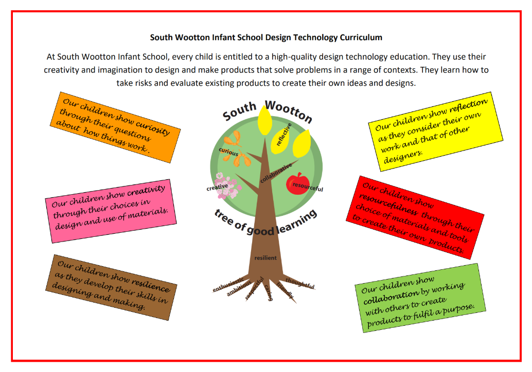 At South Wootton Infant School, every child is entitled to a high-quality design technology education. They use their creativity and imagination to design and make products that solve problems in a range of contexts. They learn how to take risks and evaluate existing products to create their own ideas and designs.
